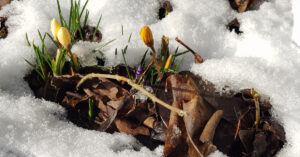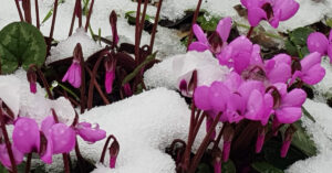 Aber tatsächlich zeigen die ersten Frühblüher jetzt schon ihre bunten Blüten. Wegen des Schnees muss man schon ein bisschen genauer hinschauen, um sie zu entdecken. Nur einige Zentimeter hoch leuchten gelber Winterlinge, rosa Alpenveilchen und violette Krokusse. Die weißen Blütenkelche der Schneeglöckchen fallen dagegen kaum auf.